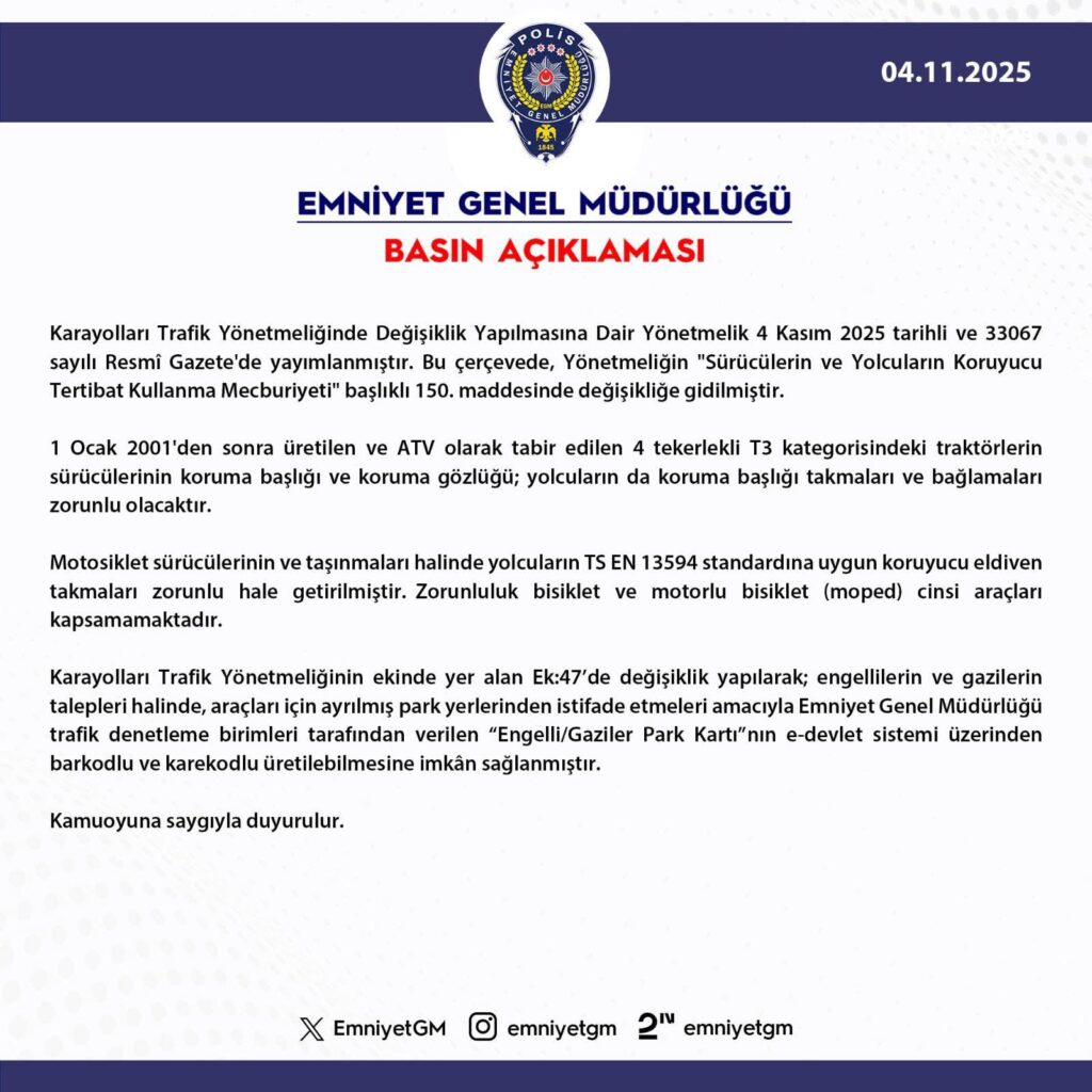 Karayolları Trafik Yönetmeliğinde Değişiklik Yapılmasına Dair Yönetmelik 4 Kasım 2025 tarihli ve 33067 sayılı Resmî Gazete’de yayımlanmıştır. Bu çerçevede, Yönetmeliğin “Sürücülerin ve Yolcuların Koruyucu Tertibat Kullanma Mecburiyeti” başlıklı 150. maddesinde değişikliğe gidilmiştir.1 Ocak 2001’den sonra üretilen ve ATV olarak tabir edilen 4 tekerlekli T3 kategorisindeki traktörlerin sürücülerinin koruma başlığı ve koruma gözlüğü; yolcuların da koruma başlığı takmaları ve bağlamaları zorunlu olacaktır.Motosiklet sürücülerinin ve taşınmaları halinde yolcuların TS EN 13594 standardına uygun koruyucu eldiven takmaları zorunlu hale getirilmiştir. Zorunluluk bisiklet ve motorlu bisiklet (moped) cinsi araçları kapsamamaktadır.Karayolları Trafik Yönetmeliğinin ekinde yer alan Ek:47’de değişiklik yapılarak; engellilerin ve gazilerin talepleri halinde, araçları için ayrılmış park yerlerinden istifade etmeleri amacıyla Emniyet Genel Müdürlüğü trafik denetleme birimleri tarafından verilen “Engelli/Gaziler Park Kartı”nın e-devlet sistemi üzerinden barkodlu ve karekodlu üretilebilmesine imkân sağlanmıştır.Kamuoyuna saygıyla duyurulur.🔹 @EmniyetGM🔹 emniyetgm.gov.tr